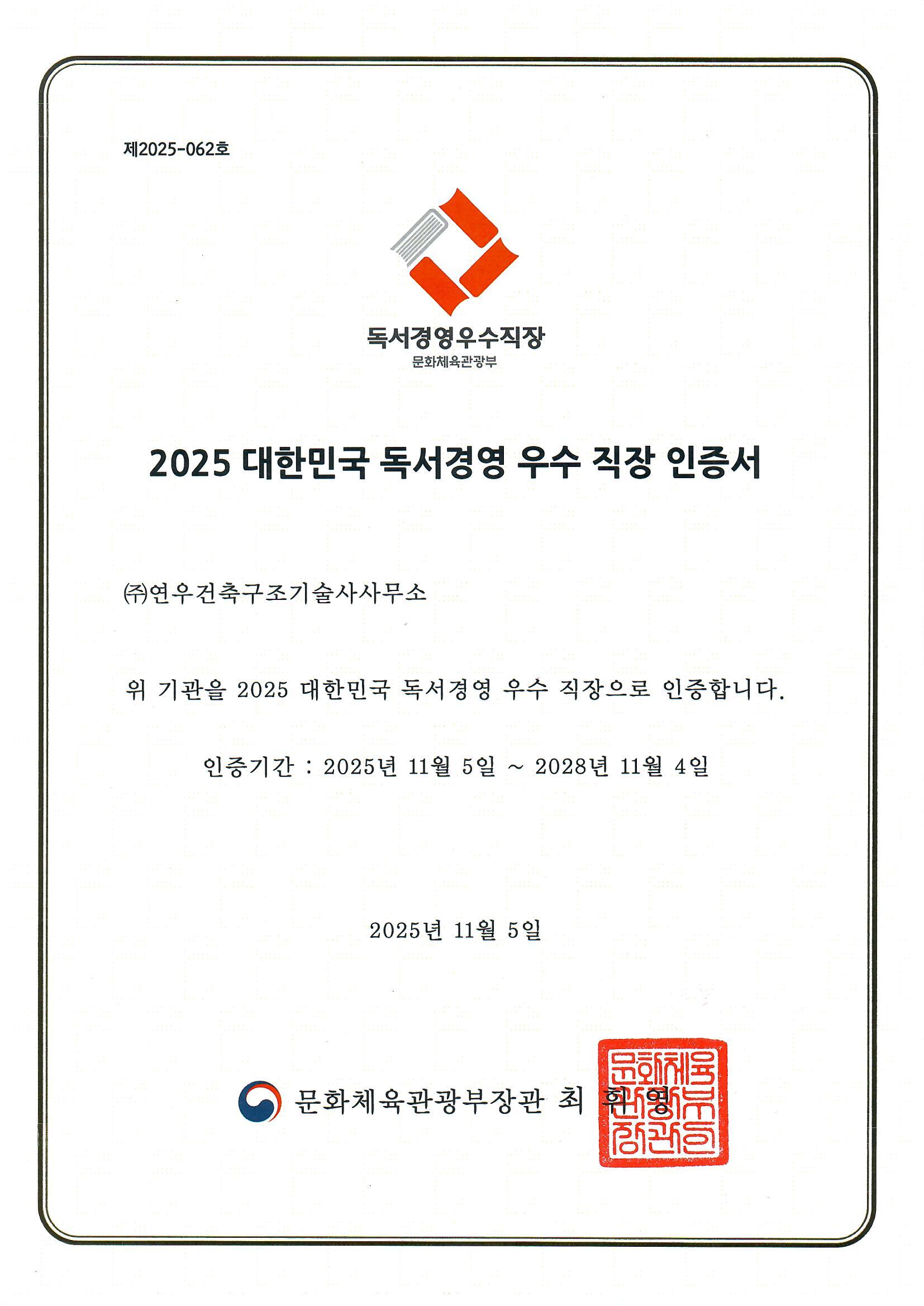 연우구조가 ‘독서경영 우수직장 인증사업’에서 3년 연속 인증을 받았습니다.